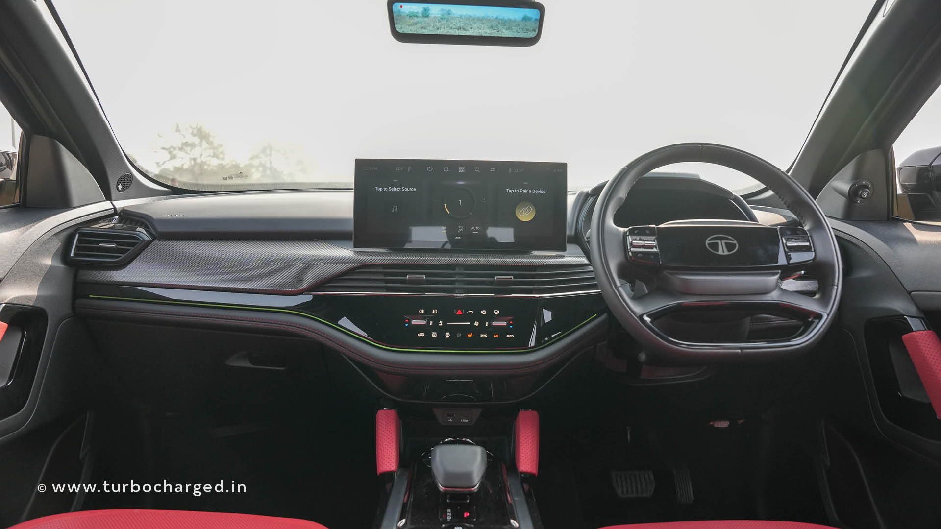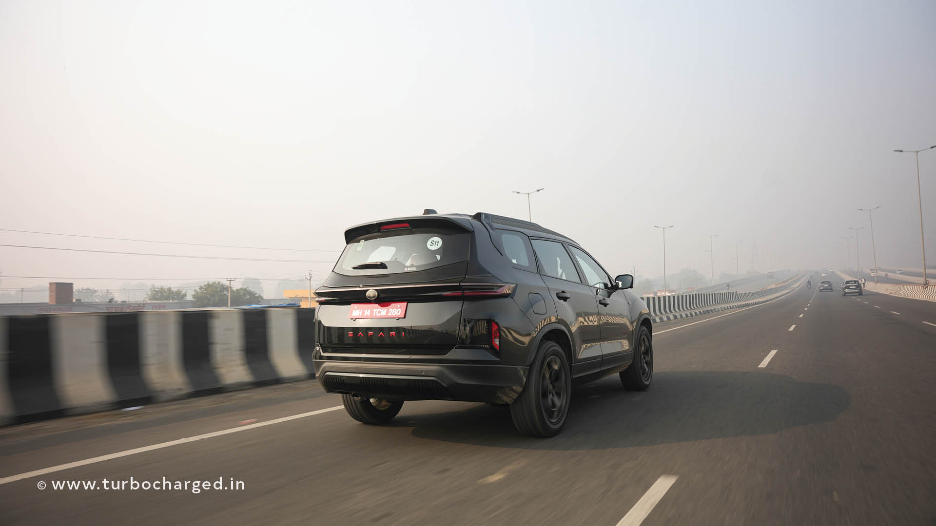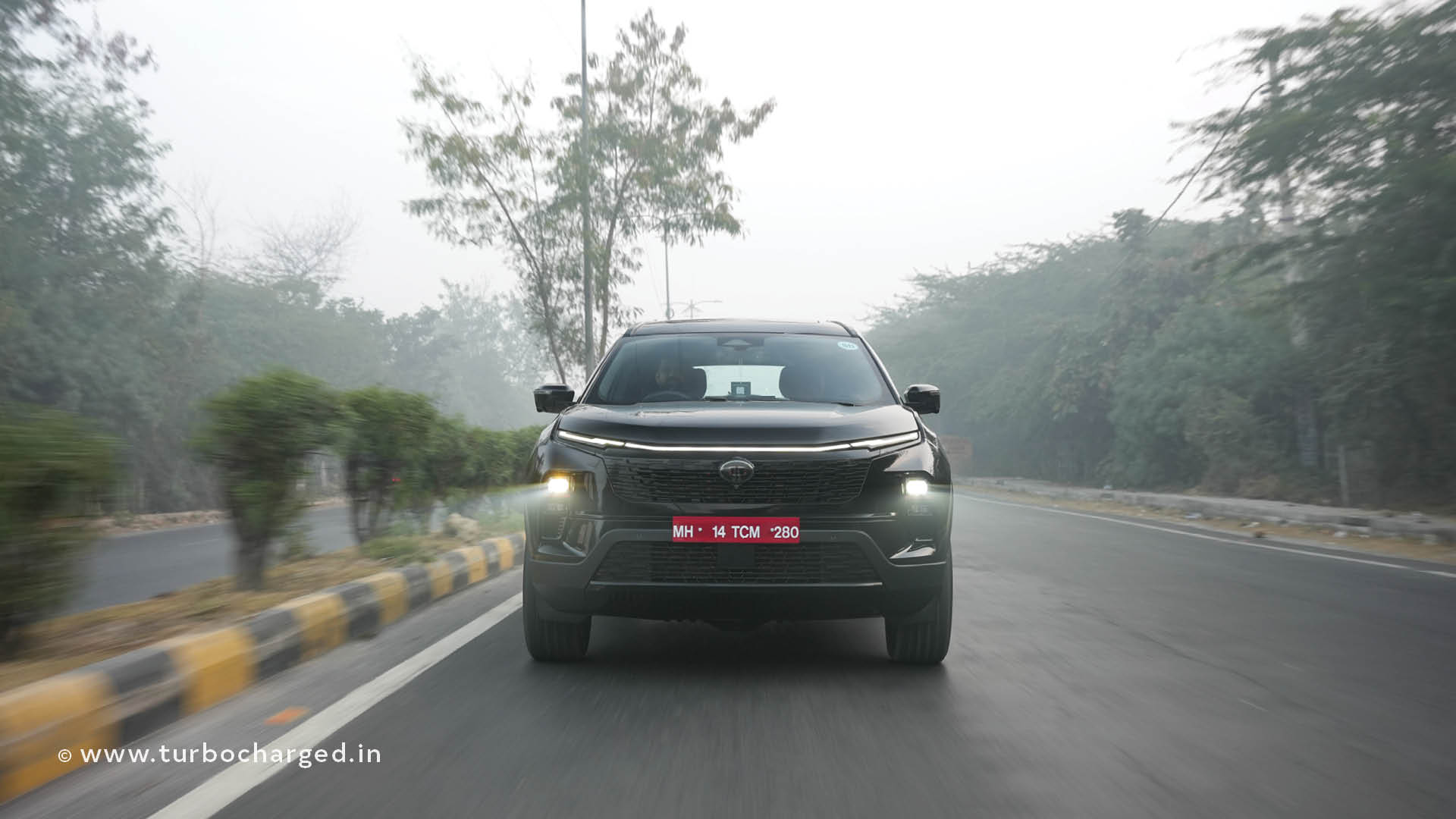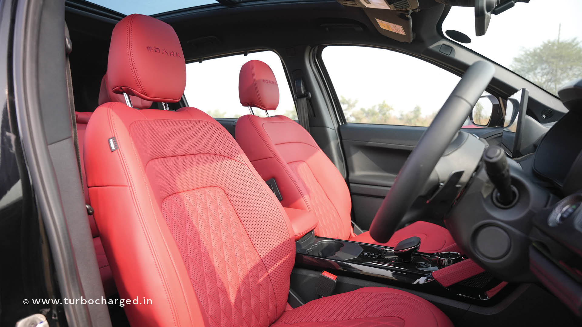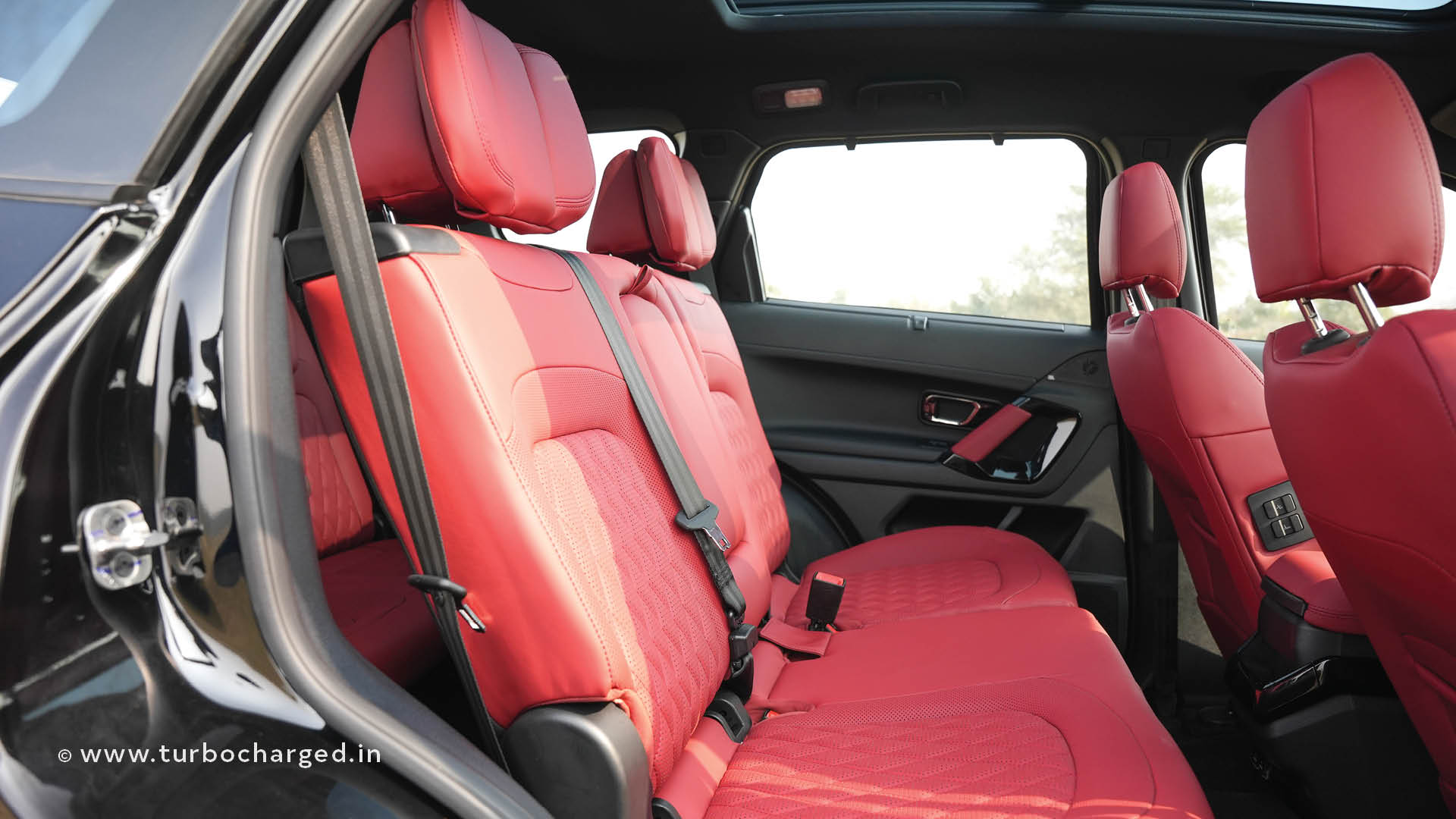 The Safari petrol remains unchanged mechanically other than the driveline. However, it is available in this new ‘Carbon Black’, exterior colour. This is also part of the Dark series, as the badging says, and has touches of scarlet via the brake calipers. There is more red on the inside, with a Carnelian Red interior in our test vehicle. Other new additions are the 14.5-inch qLED Samsung display that debuted on the Harrier EV, a 10 speaker JBL audio system with surround sound capability, and an inbuilt front and rear dashcam. The rearview mirror is a display fed from a camera mounted on the shark-fin antenna. The rest is as before, both inside and out, so we’ll move to the meat of the matter.