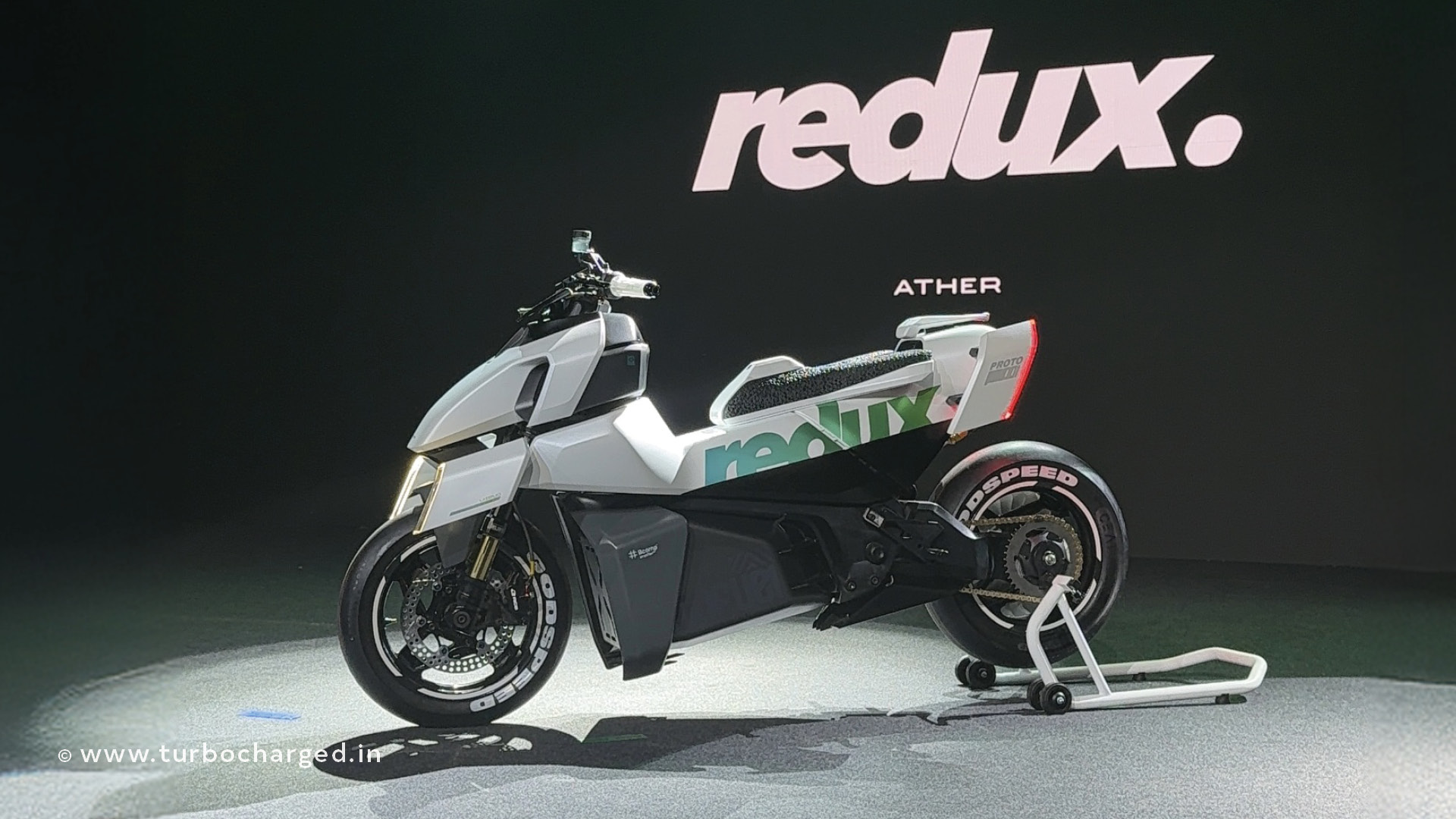 Another concept unveiled at the Ather Community Day was the Redux, a futuristic concept moto-scooter that blends the looks of a scooter with the character of a motorcycle. It features a lightweight aluminium frame, a 3D-printed lattice seat, and body panels made from advanced new materials. This funky-looking scooter had some unique features like adaptive ride dynamics that adjusts the suspension and power delivery as per the rider’s input. It even comes with a launch mode for setting off the line with maximum power and traction, something similar to what supercars come with.