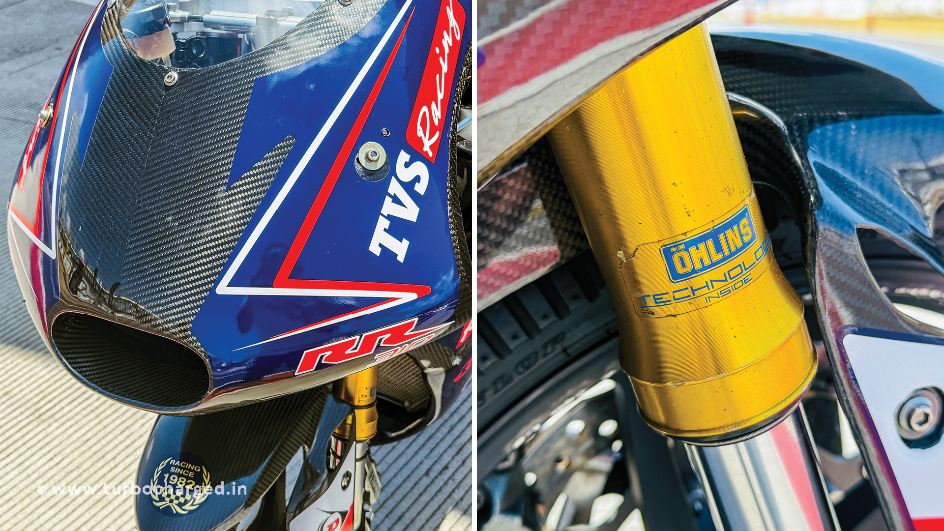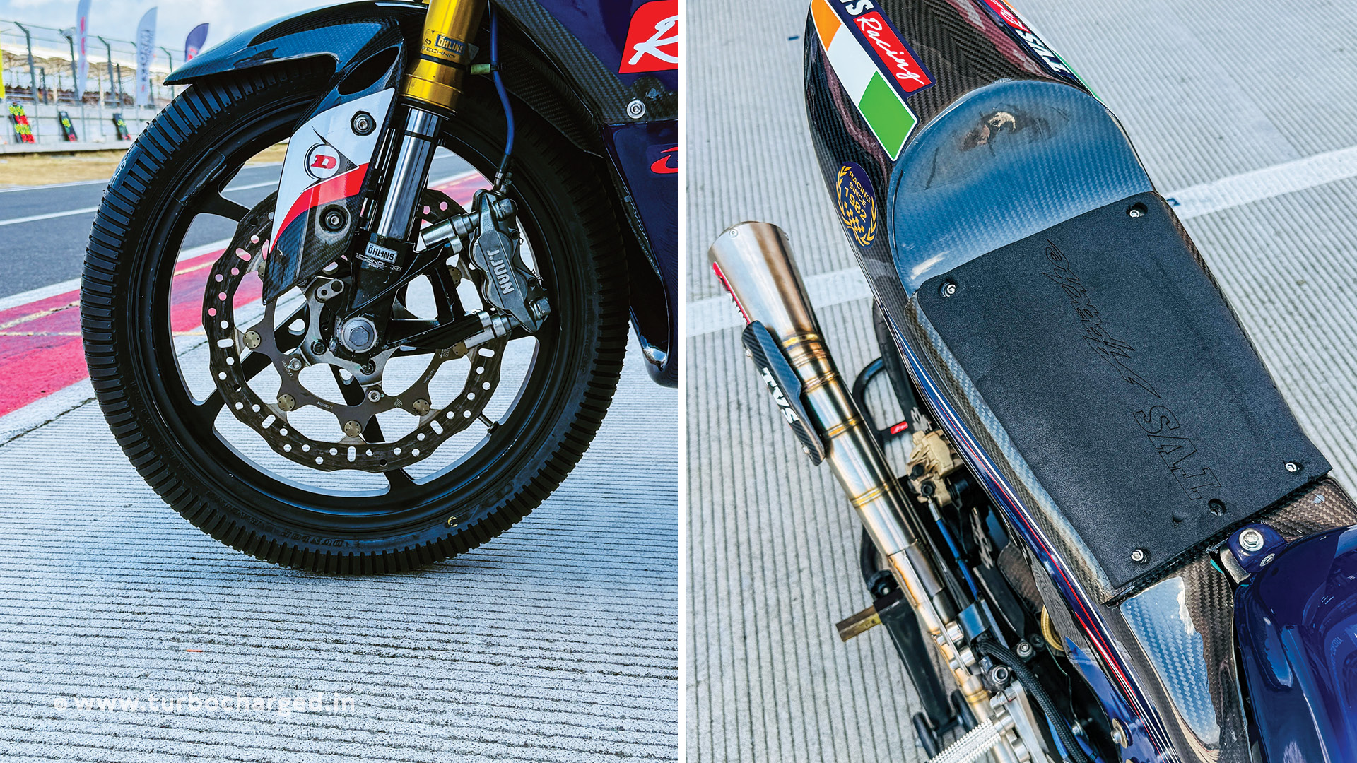 What caught my attention first was the exotic carbon fibre bodywork. Actually, that was after I noticed the massive, gaping air intake, the shape of the fairing itself, the bike’s lean form and its drop ultra-aerodynamic design. Heck, if you were to take off the TVS Racing decals, you cannot really tell the race bike is based on the TVS Apache RR310! The carbon fibre bodywork results in massive weight savings, besides which, the clear coat of lacquer on the fairing had the carbon fibre beneath it glisten and add huge dollops of exoticness.