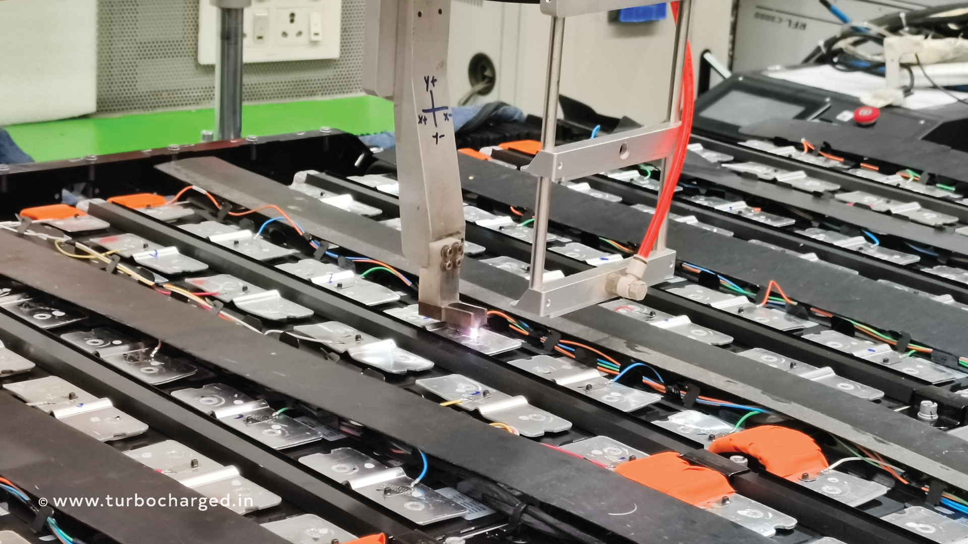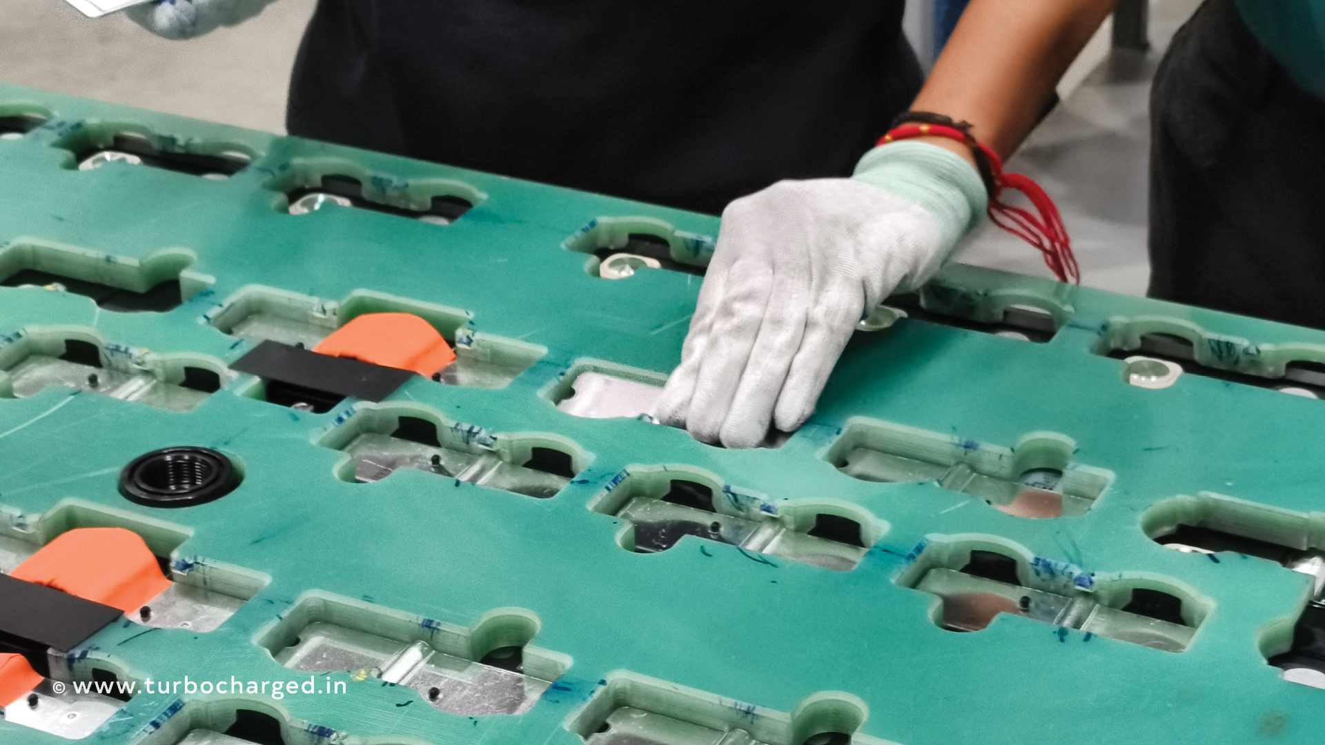 The process starts with the prismatic cells being checked for voltage discrepancies via the open circuit voltage test, while the battery tray is prepped with insulation and the cooling system is checked for leaks. Once the cooling system is secured with bolts, glue is added in the next step. After that, the cells are loaded onto the tray, and then the bus bars are placed.