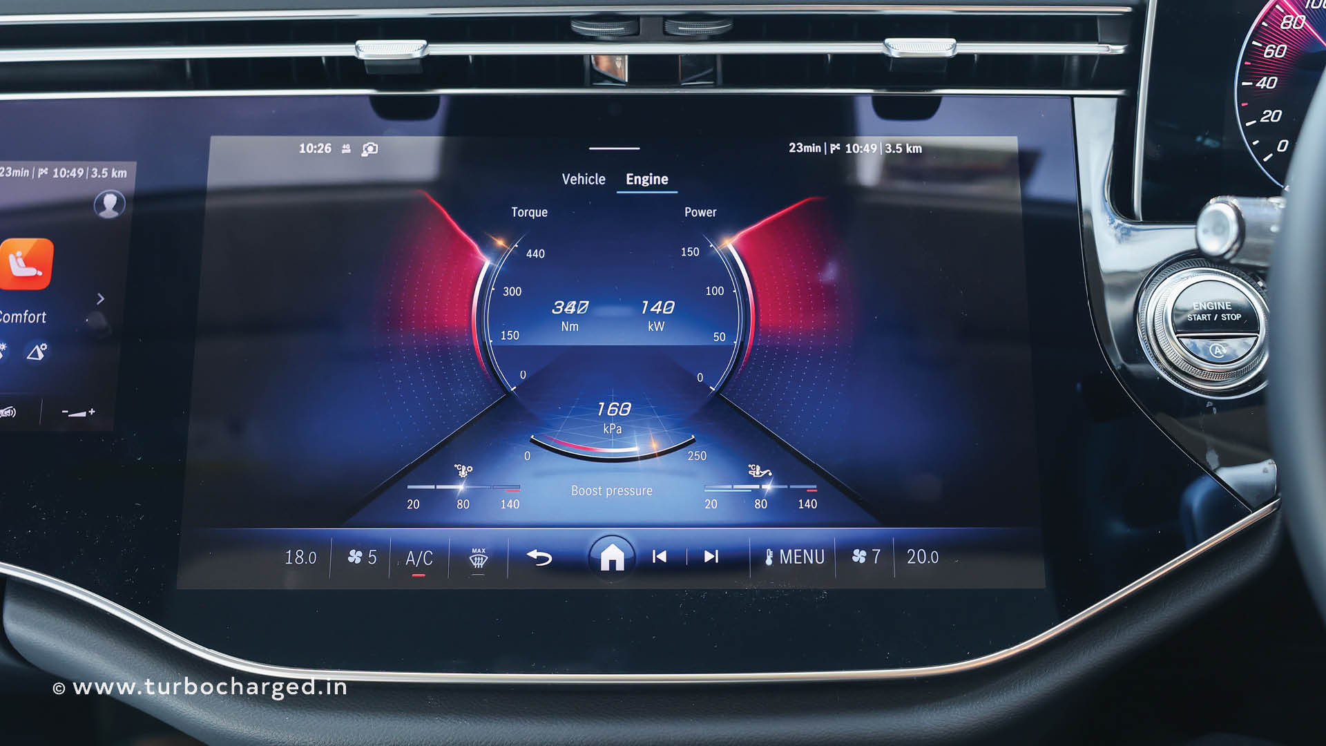 In terms of aesthetics, features, luxury and comfort, the E 220d is identical to its petrol-powered twin, the E 200. The exterior exudes luxury but in a subtle way. And since we only get the long-wheelbase version of the E-Class, the overall silhouette and proportions are just right and elegant. One unique feature worth mentioning is the three-point star tail lamp layout that makes the E instantly identifiable. On the inside, it continues with the same EQ-inspired cabin, loaded with tech including the MBUX Superscreen, powered seats with memory function, four-zone climate control, wireless charging pads, well-countered seats wrapped in leather, a panoramic sunroof, reclining rear seat backrests, and more. In fact, the list is so extensive that we would need a whole page to list them.
