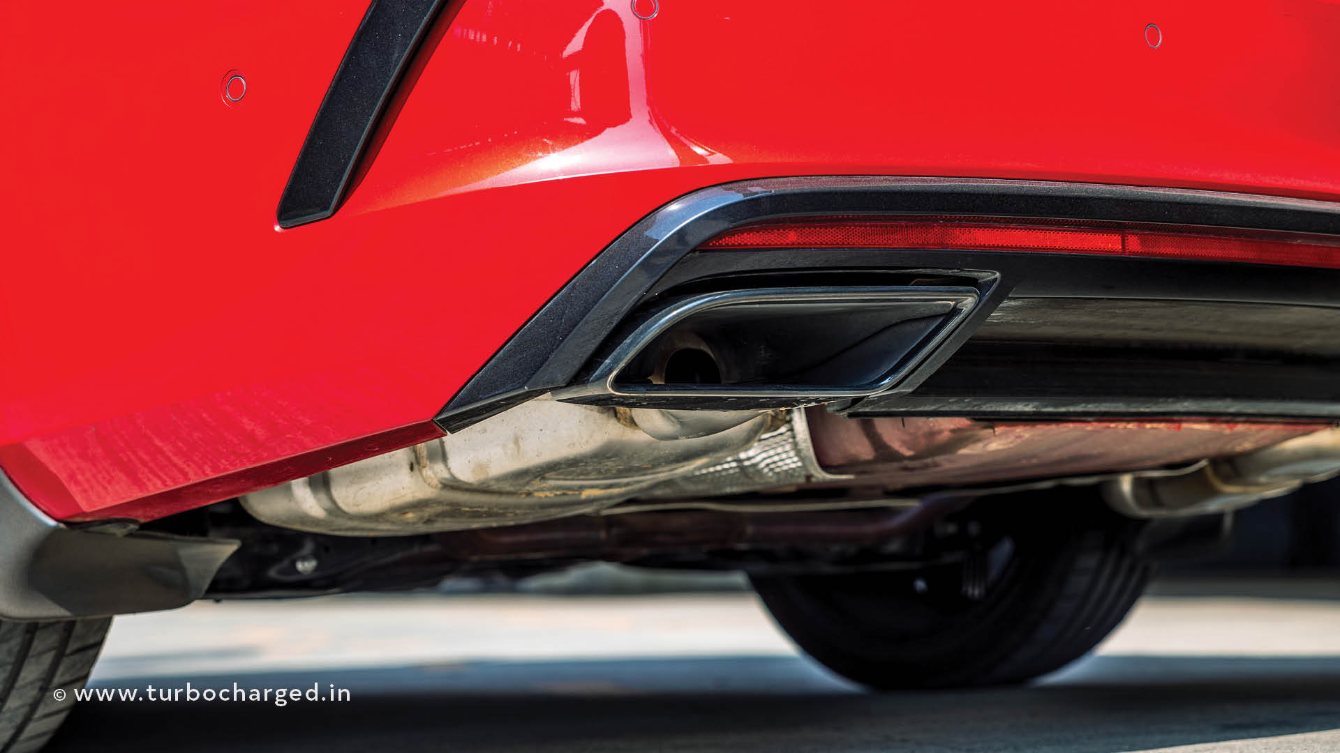 The headlamp design also helps you distinguish this one from the Octavia that was launched in India in 2021, as the DRL design is new and flows into the bumper to say so. Being the RS, this one also gets a blacked-out grille with an RS badge and a more aggressive bumper design. The car also sits lower by 15mm courtesy the sport suspension that comes standard, and it should be interesting how well the car can clear typical Indian speed breakers or handle broken roads. The car runs on sporty-looking 19-inch alloy wheels and from the sides, the RS also has that oh-so-gorgeous appeal that’s typical of performance sedans. The rear end accentuates that feel further, thanks to the lip spoiler and of course, the twin exhausts.