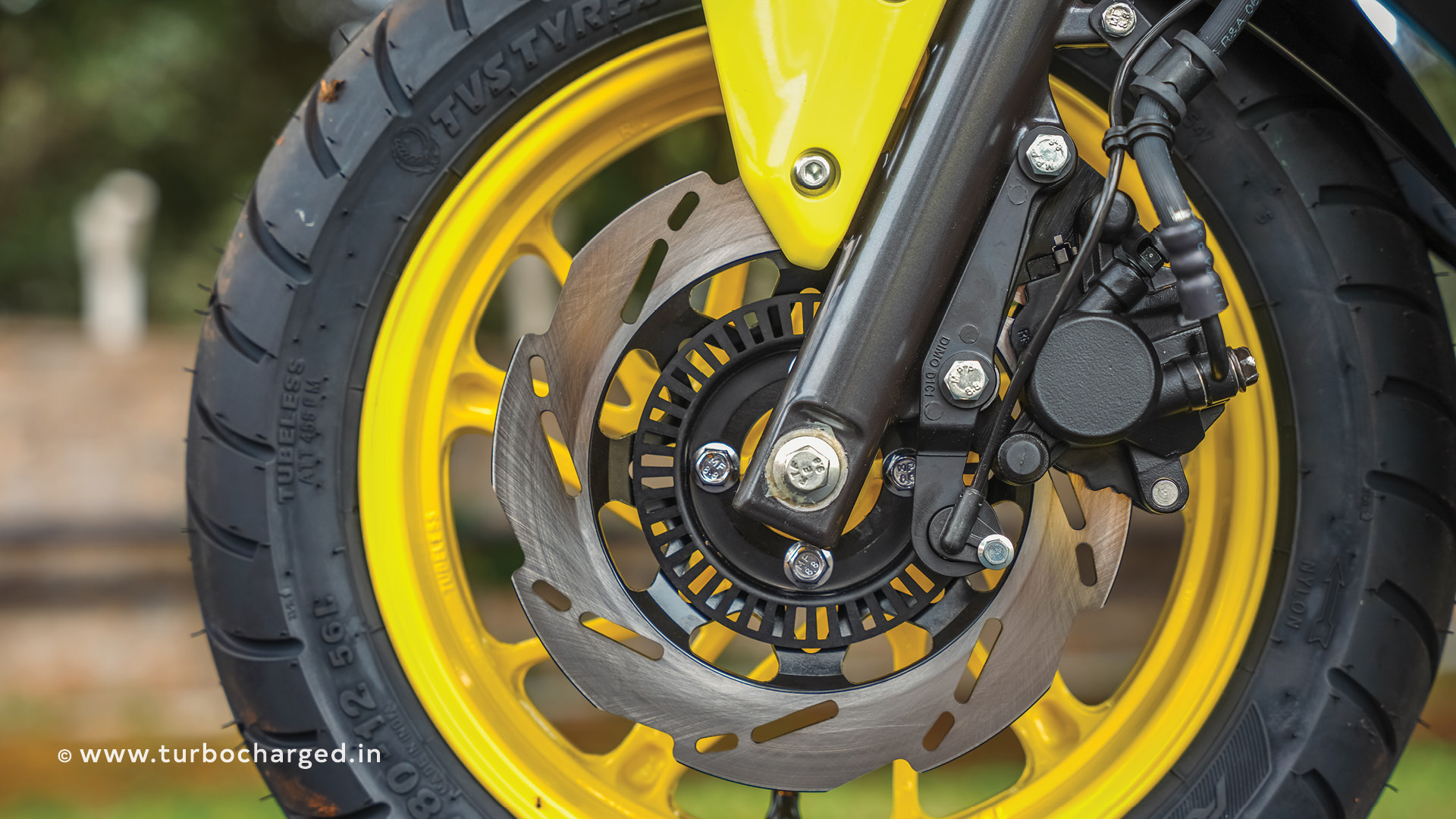 The rev-happy engine makes its peak power of 13.2PS at 7,000rpm and delivers a peak torque of 14.2Nm at 5,500rpm. Acceleration is brisk, and speed builds up quickly enough. TVS claims a top speed of 104kmph, but we managed to hit an indicated 110kmph on the track. The front brake felt sharp and had enough bite, while the rear drum brake helps you shave speeds when used along with the front. The single-channel ABS only intervenes when you do some heavy braking, and since we rode it on the track, we did manage to engage it a couple of times.