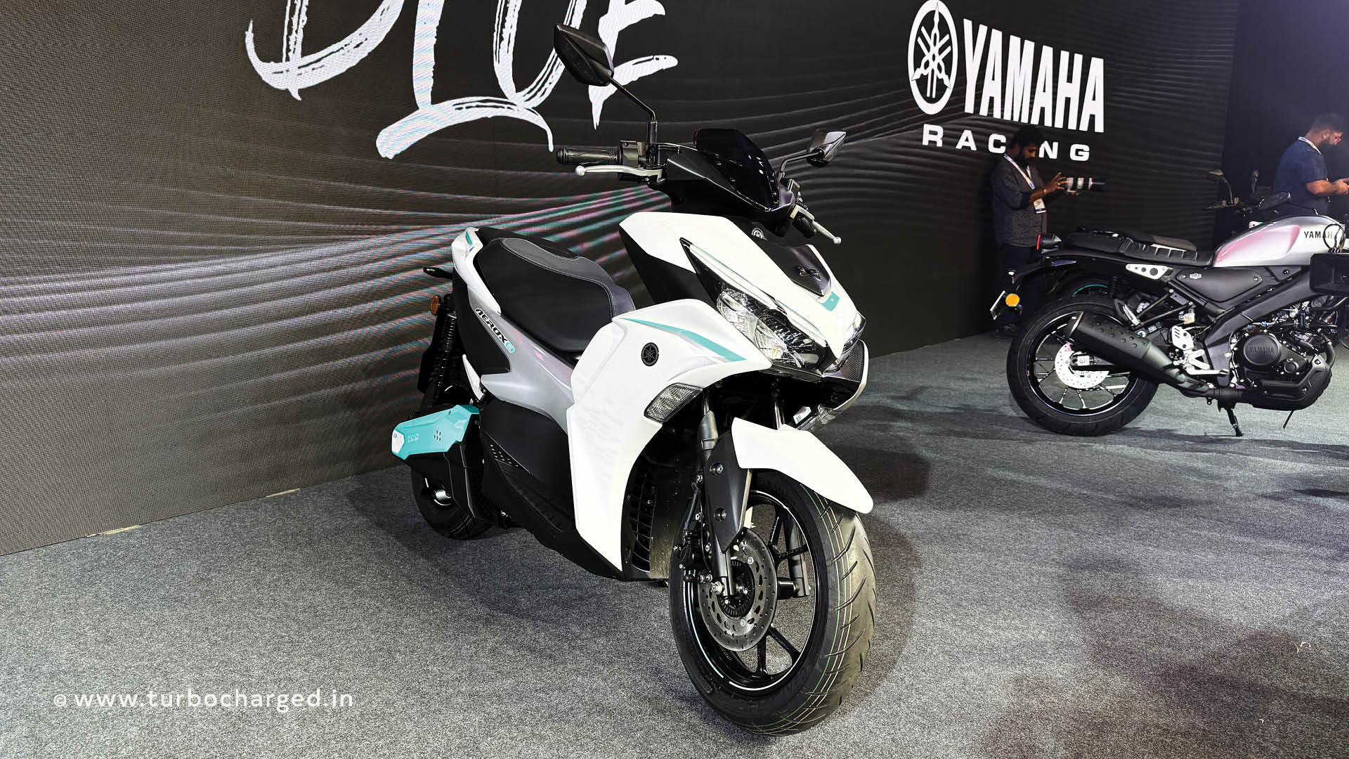 The Aerox E is powered by an electric motor producing 9.4kW (12.8PS) and 48Nm. Yamaha has opted for dual removable batteries of 3kWh capacity. There are three riding modes as is the norm–Eco, Standard, and Power–with an additional ‘Boost’ function. There’s also a reverse mode, and a claimed range of 106 kilometres. The Aerox E gets all-LED lighting comprising dual LED Class D headlamps, LED turn indicators and an LED tail lamp. There’s a large colour TFT screen with turn-by-turn navigation. The Y-connect mobile app connectivity provides further options, including a Multi-Information Display (MID), as well as maintenance reminders and the last parked location. The Aerox-E gets front and rear disc brakes and single-channel ABS for enhanced safety.